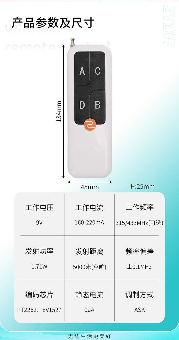 ZY107是一款大功率無(wú)線(xiàn)遙控器,具有可靠性高、頻率穩(wěn)定、穿透能力強(qiáng)、遠(yuǎn)距離等特點(diǎn);