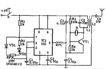 L1可用10K型中周骨架,用Φ0.15高強度漆包線繞9匝,L2在L1的外層用同型號漆包線繞3匝,不用屏蔽罩,但需旋入磁芯。L3同L1制作。B用JAl2等金屬殼諧振器,頻率在27-29.8MHz之間。VT1、VT2、VT3均用3DG130D型NPN三極管,β>100。VT4選用3DD15D型大功率管。RFC用18uH色碼電感。IC1的型號為NE555。IC2的型號為LM386。電容除標明的電解電容外均用CC1型高頻瓷介電容。電阻均用1/8w碳膜電阻器。