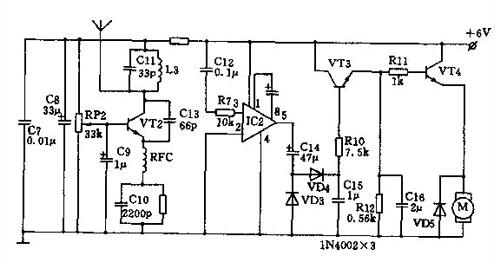 下圖為接收驅動電路。為簡化接收電路,由VT2及其外圍元件構成超再生檢波器,檢出原方波調制信號。由C12、R7加至IC2的③腳進行放大,放大后的信號經VD3、VD4倍壓整流,由VT3射隨器輸出平滑的直流電壓。該電壓的大小與發(fā)送的不同占空比信號波形有關,占空比大,電壓高,經R11為VT4提供的偏置電流大,電機的轉速高;占空比小,電壓低,經R11為VT4提供的偏置電流小,電機轉速慢。當占空比足夠小時,VT3截止無輸出,VT4因失去偏置而不導通,電機M停轉。由此可得電機轉速與占空比成正比關系。
