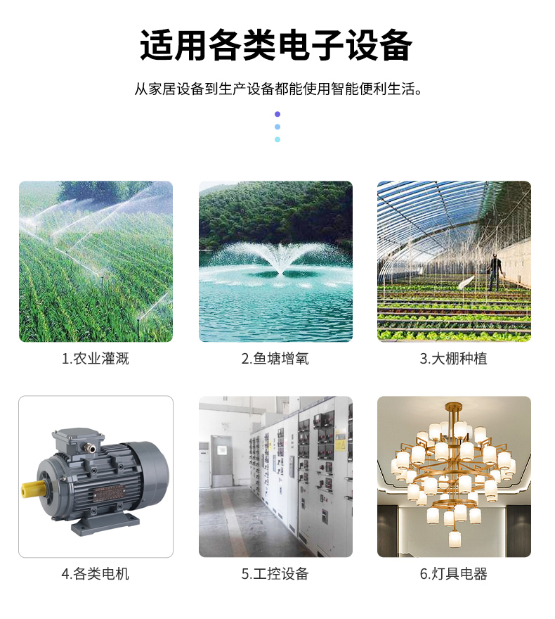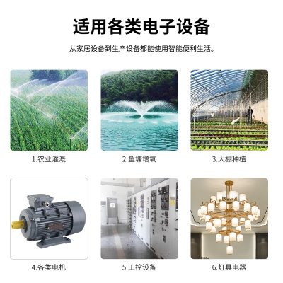 農(nóng)業(yè)灌溉、魚塘增氧、大棚種植、各類電機(jī)、工控設(shè)備、燈具電器