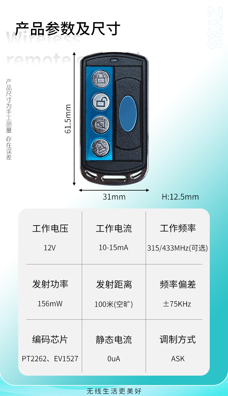 ZY33-5是一款具有5個(gè)觸發(fā)按鍵的無線遙控器,一般應(yīng)用于無線電設(shè)備的遙控;防盜系統(tǒng)、工業(yè)或家庭遙控控制等。