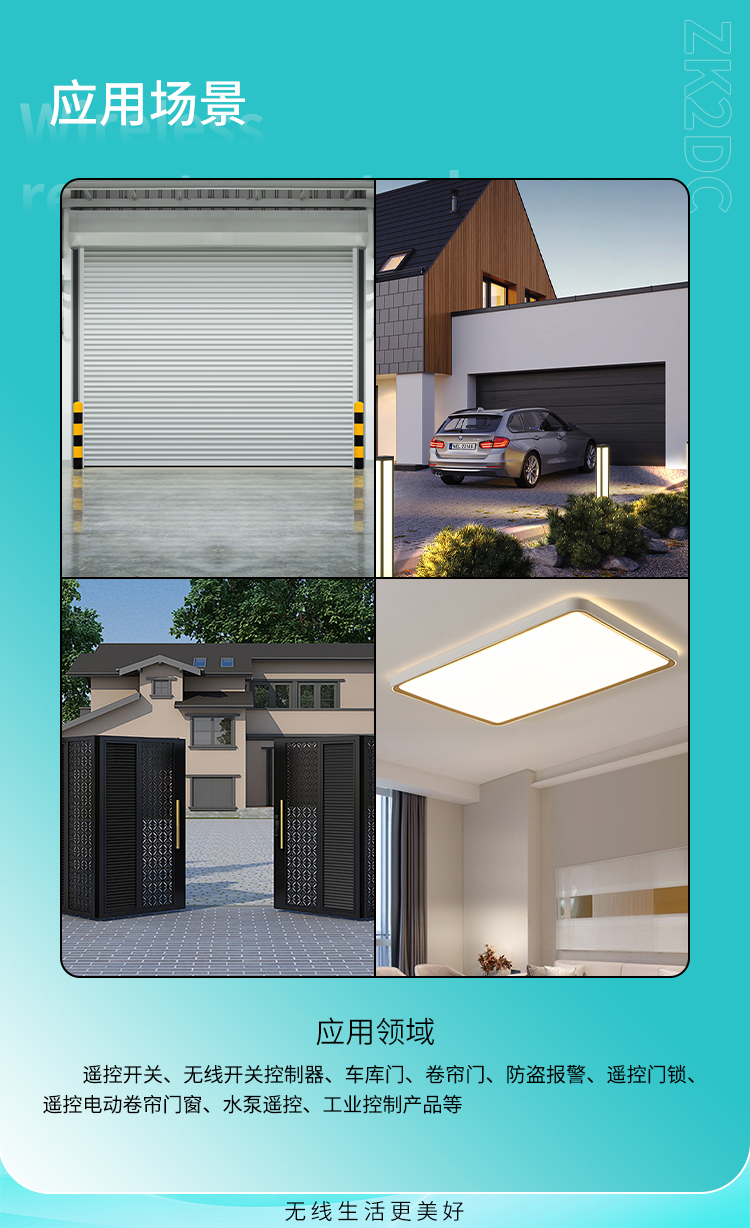 主要應(yīng)用于燈光控制、車庫(kù)門控制、電動(dòng)門、遙控窗簾、起吊設(shè)備、電機(jī)控制、水泵、投影幕升降器控制及安防行業(yè)等領(lǐng)域。