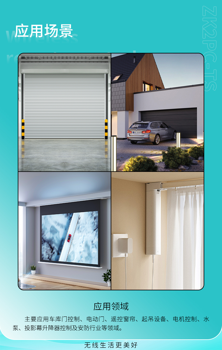 主要應(yīng)用于燈光控制、車庫門控制、電動門、遙控窗簾、起吊設(shè)備、電機控制、水泵、投影幕升降器控制及安防行業(yè)等領(lǐng)域。