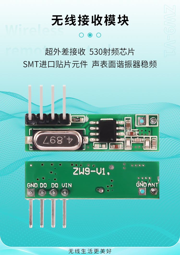 ZW9-V1接收模塊采用最新研制的超高頻,超外差、低噪聲芯片,具有高抗干擾能力