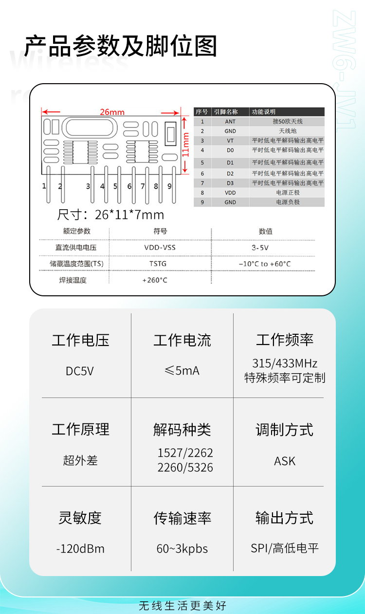 ZW6-JV1是一款超外差、帶解碼的接收模塊,它具有高靈敏、低功耗、高性價比的優(yōu)勢。